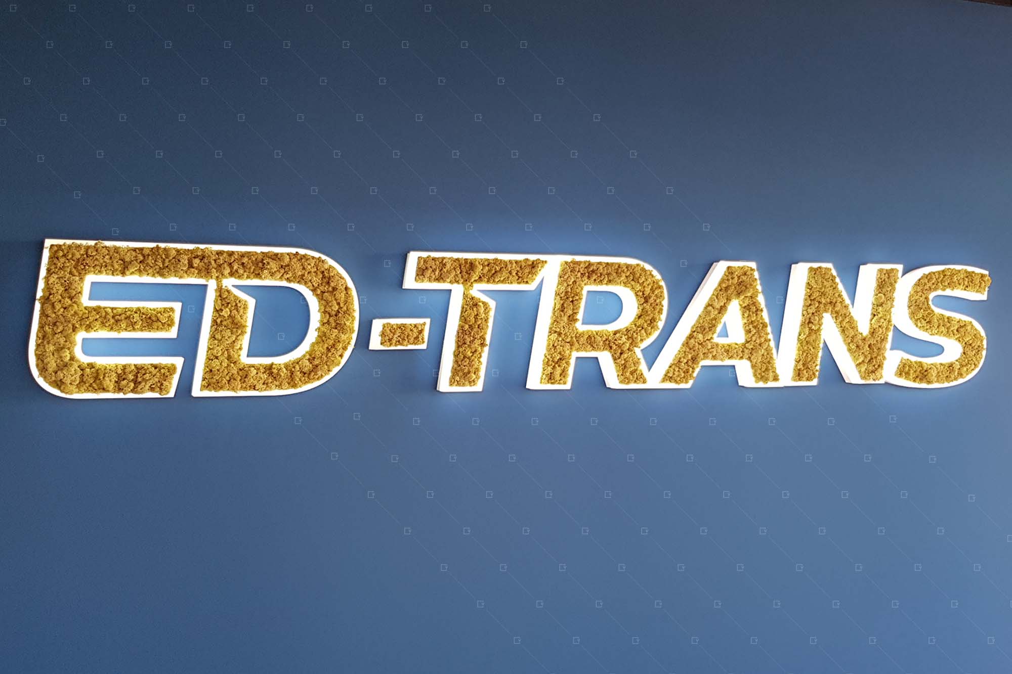 De ces appréciations d’une grandeur partagée est né un logo. Un logo éclairé entièrement façonné et conçu sur mesure, pouvant décrire ED Trans dans sa globalité et permettant d’apporter aux locaux une ambiance relaxante et apaisante aux collaborateurs. Ce logo éclairé creusé est conçu de lichen neutre, ce végétal stabilisé se prête tout à fait à ces locaux contemporains et permet d’accorder à l’accueil une mise en lumière douce et bienveillante. Ce logo végétal lumineux complète un ensemble de créations végétales intégrant un mur en mappemonde sur fond de panneaux de liège, un grand mur végétal stabilisé ainsi que quelques autres décors végétaux adaptés à leurs emplacements respectifs.