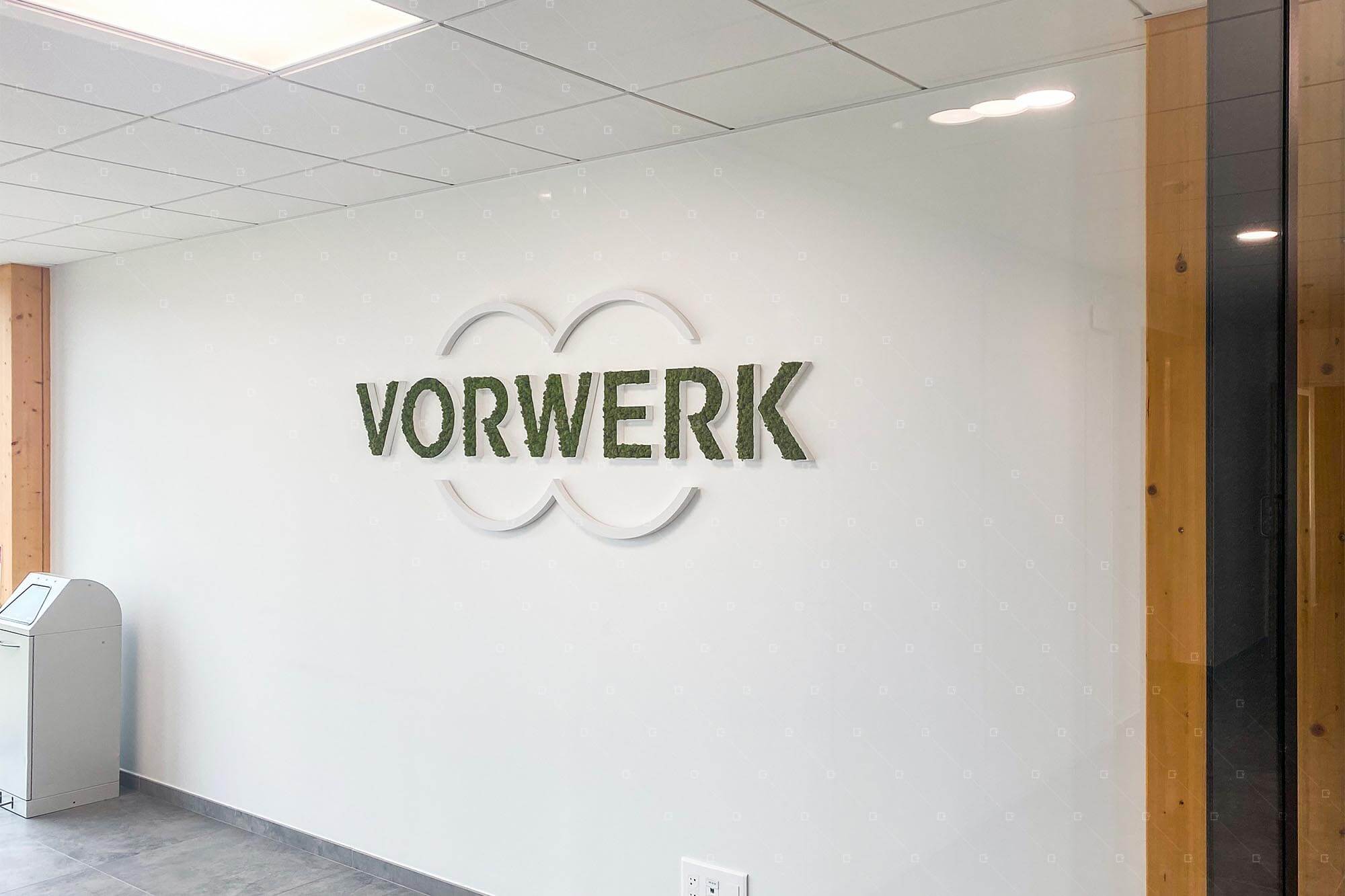 Le logo végétal réalisé pour Vorwerk est composé de lettres en PVC blanc partiellement creusées afin d’accueillir du lichen stabilisé. Cette technique de lettrage creusé crée un contraste élégant entre le blanc immaculé du support et la texture naturelle du végétal, générant un effet visuel sophistiqué qui attire immédiatement le regard. Cette solution technique requiert cependant un format minimum pour garantir une finition de qualité. Le logo végétal avec des lettres creusées doit respecter certaines dimensions pour permettre à la fois l’intégration des végétaux stabilisés et l’usinage précis du support. En dessous d’un certain format, il devient impossible pour les experts végétaux de Cadre Vert d’intervenir avec la minutie nécessaire. Les dimensions finales du projet Vorwerk ont permis de réaliser ce type d’installation dans des conditions optimales.
