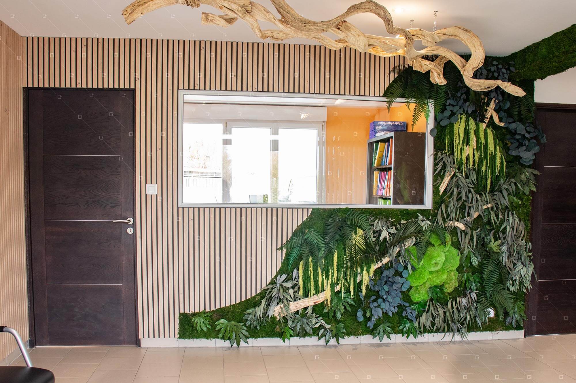 La solution : plusieurs murs végétaux stabilisés et panneaux bois acoustiques