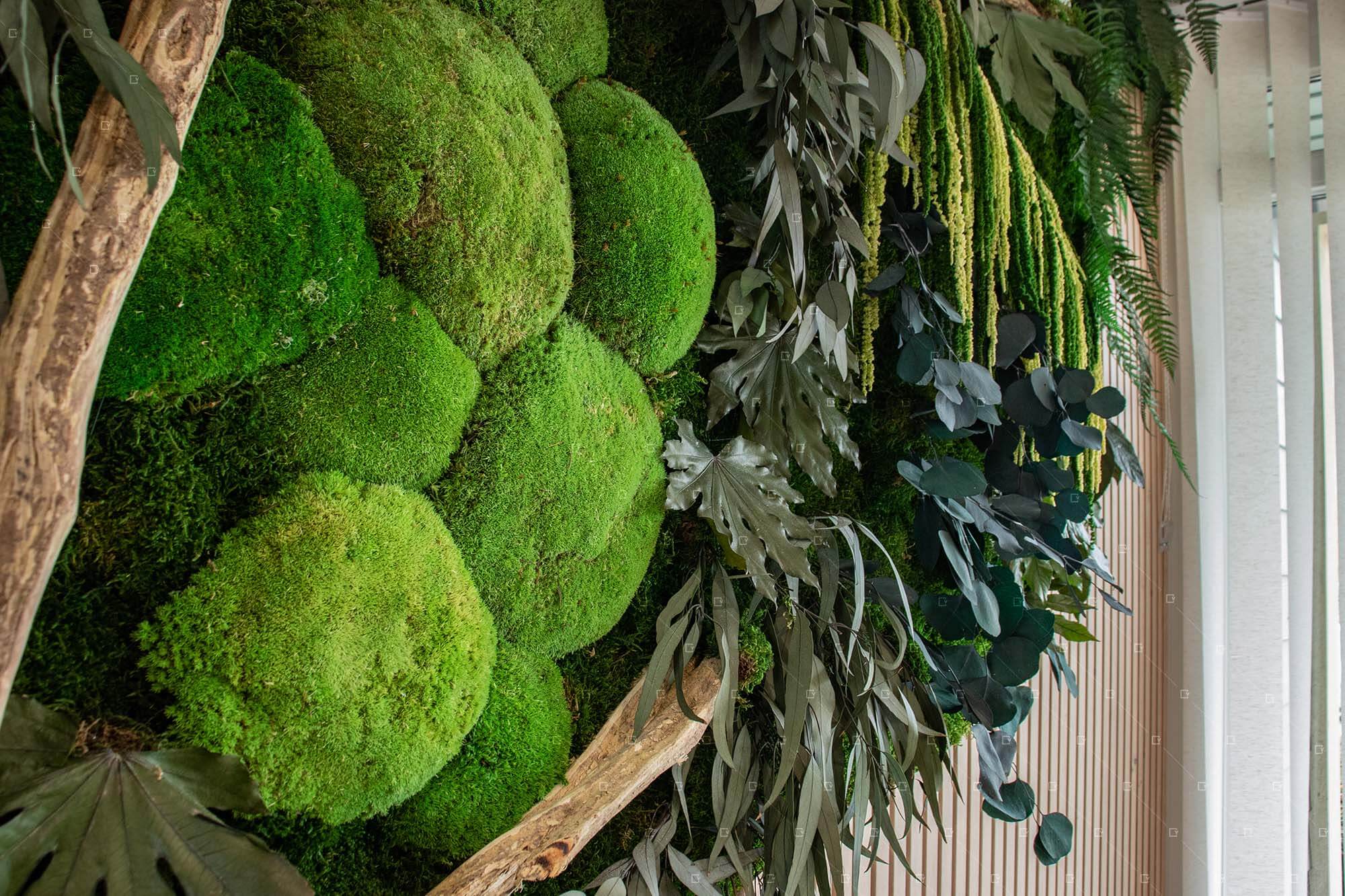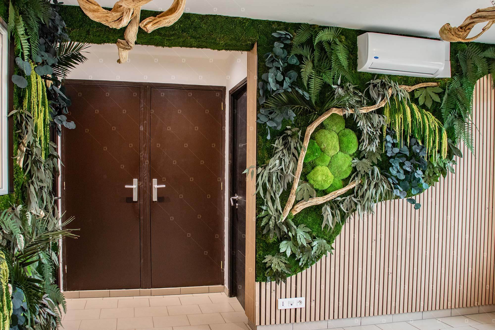 L’effet immersif recherché repose sur la stratification des volumes végétaux : certaines frondaisons débordent légèrement du cadre, d’autres créent des reliefs marqués, tandis que les mousses apportent une continuité apaisante. Cette orchestration végétale transforme l’espace d’accueil en antichambre vers un univers différent, où la nature s’impose comme élément central de l’identité spatiale.