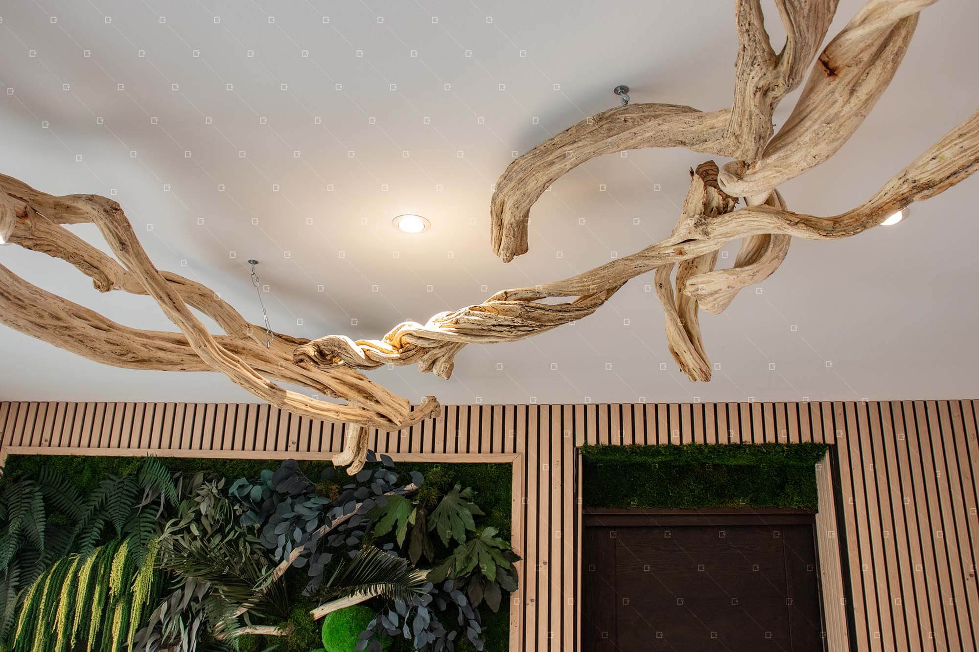 Pour répondre à cette double exigence, Cadre Vert a conçu une installation sur mesure combinant végétal et technologie acoustique. Plusieurs murs végétaux stabilisés issus de la collection Jungle ont été intégrés aux surfaces stratégiques, créant des points focaux visuels à fort impact.