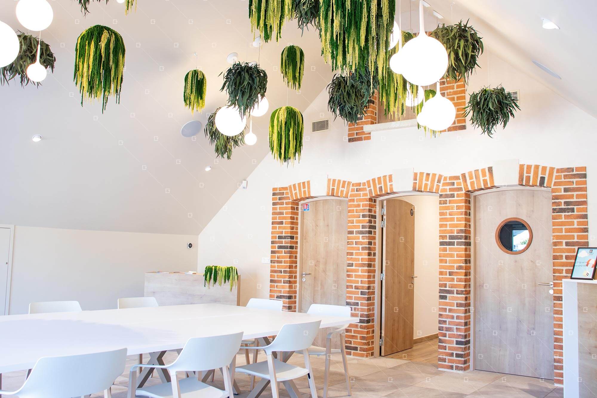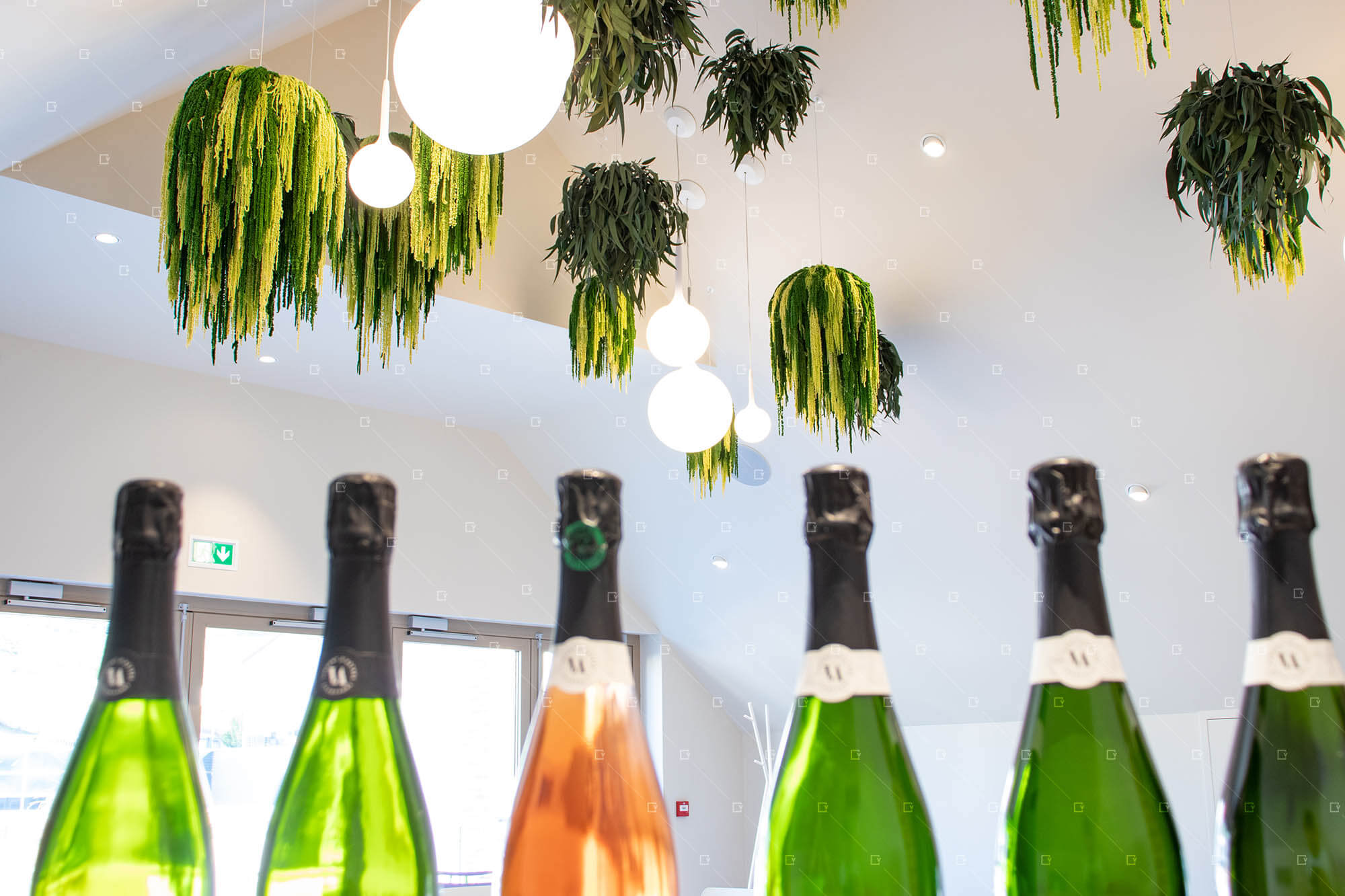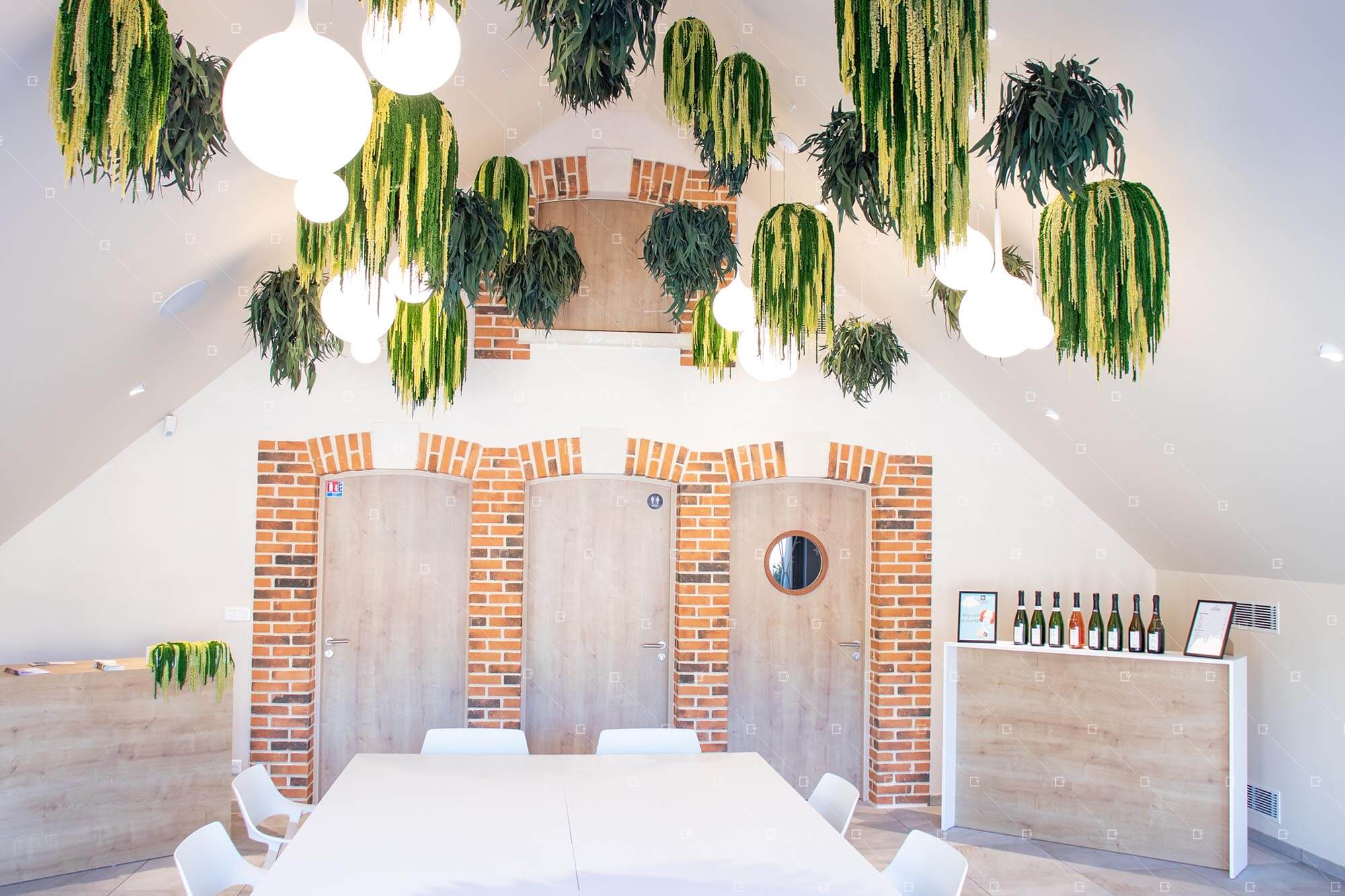 Chaque suspension présente des formats variés, des diamètres différents et des chutes adaptées, permettant d’obtenir un effet esthétique harmonieux et vivant, tout en s’intégrant aux volumes de la salle. L’ensemble du plafond végétal a été pensé en relation avec les luminaires existants, en forme de boules rappelant les bulles du champagne, symbole du métier de la maison. Cette association subtile entre lumière et végétal crée une atmosphère raffinée, chaleureuse et immersive, parfaitement adaptée à la réception et aux événements de la maison.