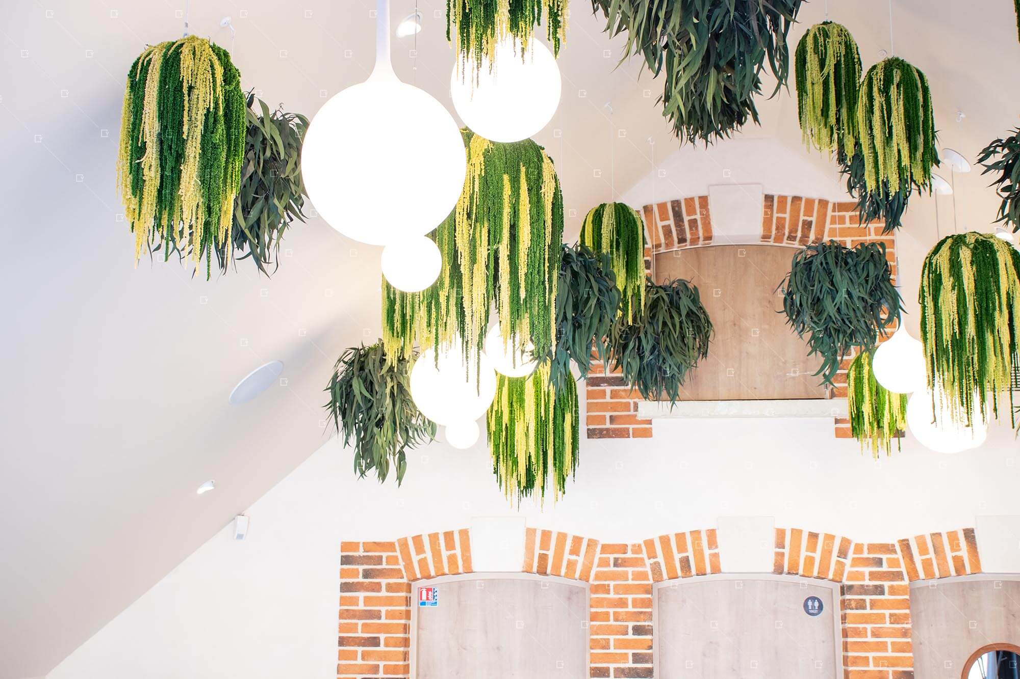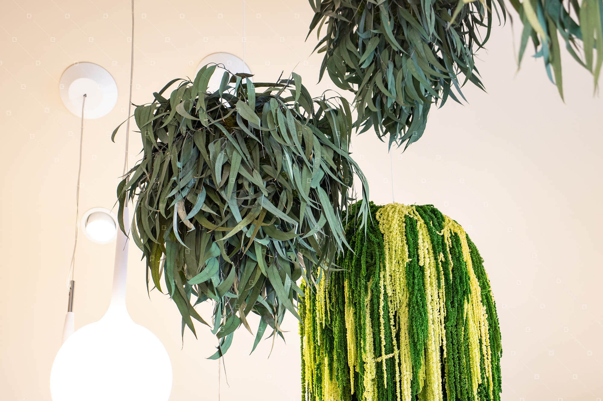 Le travail de notre bureau d’études et de notre direction artistique a permis de composer un plafond harmonieux où végétaux stabilisés et luminaires dialoguent avec élégance et rebonds. Les suspensions en amarantes et eucalyptus Nicoli retombent gracieusement, créant un effet aérien qui invite le regard à se lever et transforme le plafond en un décor végétal unique.